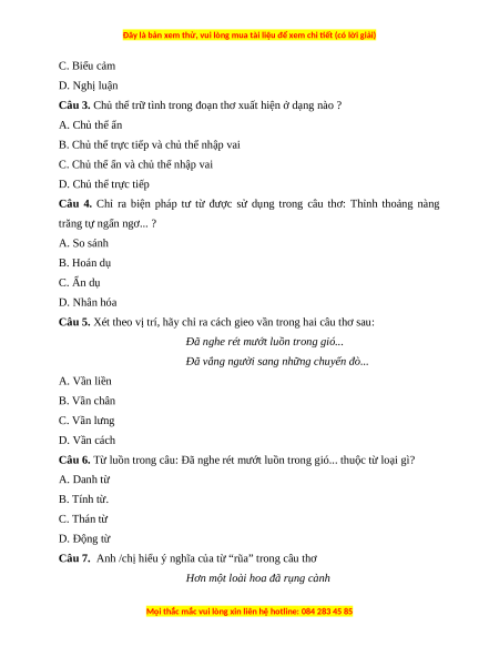 Câu 4. Chỉ ra biện pháp tư từ được sử dụng trong câu thơ: Thỉnh thoảng nàng trăng tự ngẩn ngơ... ? A. So sánh B. Hoán dụ C. Ẩn dụ D. Nhân hóa