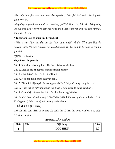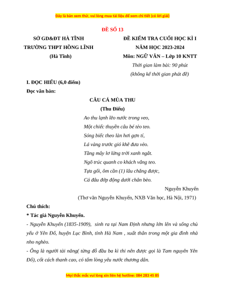 I. ĐỌC HIỂU (6,0 điểm) Đọc văn bản: CÂU CÁ MÙA THU (Thu Điếu)