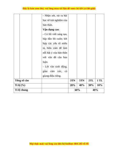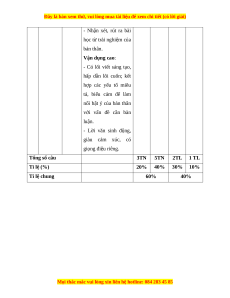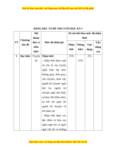 Mức độ nhận thức Tổng Kĩ Nhận Thông Vận Vận TT Nội dung % năng biết hiểu dụng dụng cao điểm TN TL TN TL TN TL TN TL Đọc 1 Truyện kể 3 0 5 0 0 2 0 0 60 hiểu Viết văn bản nghị luận về 2 Viết một tác 0 1* 0 1* 0 1* 0 1* 40 phẩm nghệ thuật Tổng 15 5 25 15 0 30 0 10 Tỉ lệ % 20% 40% 30% 10% 100% Tỉ lệ chung 60% 40%