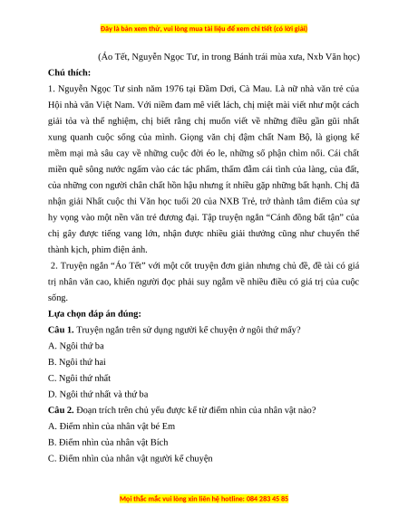 Câu 1. Truyện ngắn trên sử dụng người kể chuyện ở ngôi thứ mấy? A. Ngôi thứ ba B. Ngôi thứ hai C. Ngôi thứ nhất