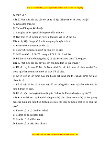 Câu 3. Phát biểu nào sau đây nói đúng về đặc điểm của lời kể trong truyện? A. Chỉ có lời nhân vật