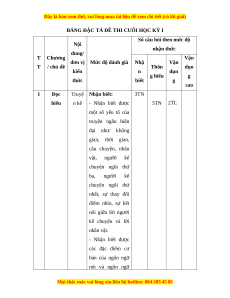 đơn vị Mức độ đánh giá Nhậ Vận T / chủ đề Thôn dụn kiến n dụn g hiểu g thức biết g cao 1 Đọc Truyệ Nhận biết: 3TN hiểu n kể - Nhận biết được 5TN 2TL một số yếu tố của truyện ngắn hiện đại như: không gian, thời gian, câu chuyện, nhân vật, người kể chuyện ngôi thứ ba, người kể chuyện ngôi thứ nhất, sự thay đổi điểm nhìn, sự kết nối giữa lời người kể chuyện và lời nhân vật. - Nhận biết được các đặc điểm cơ bản của ngôn ngữ nói và ngôn ngữ
