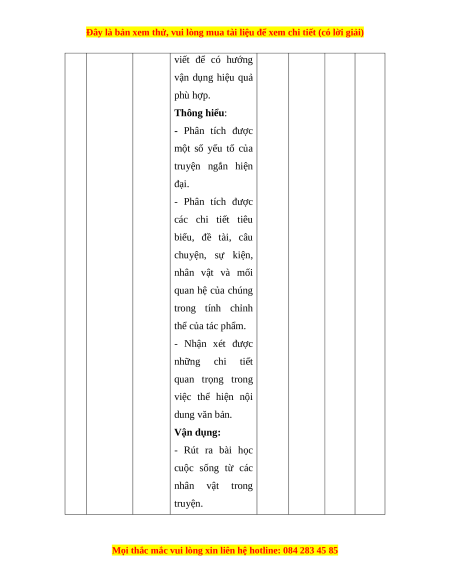 viết để có hướng vận dụng hiệu quả phù hợp. Thông hiểu: - Phân tích được một số yếu tố của truyện ngắn hiện đại. - Phân tích được các chi tiết tiêu biểu, đề tài, câu chuyện, sự kiện, nhân vật và mối quan hệ của chúng trong tính chỉnh thể của tác phẩm. - Nhận xét được những chi tiết quan trọng trong việc thể hiện nội dung văn bản. Vận dụng: - Rút ra bài học cuộc sống từ các nhân vật trong truyện.