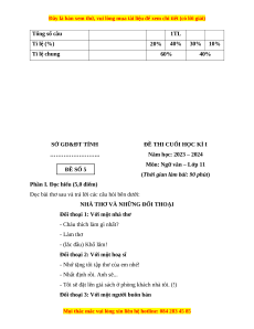 Mức độ nhận thức Tổng Kĩ Nhận Thông Vận Vận TT Nội dung % năng biết hiểu dụng dụng cao điểm TN TL TN TL TN TL TN TL Thơ Đọc 1 và truyện 2 0 2 1 0 2 0 0 50 hiểu thơ Viết văn bản nghị 2