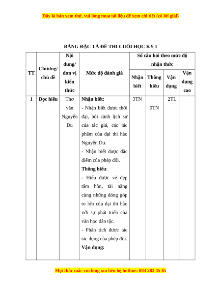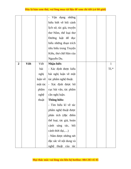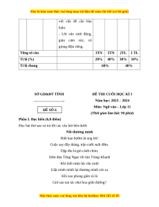 Mức độ nhận thức Tổng Kĩ Nhận Thông Vận Vận TT Nội dung % năng biết hiểu dụng dụng cao điểm TN TL TN TL TN TL TN TL Đọc Thơ văn 1 3 0 5 0 0 2 0 0 60 hiểu Nguyễn Du Viết bài nghị luận 2 Viết về một tác 0 1* 0 1* 0 1* 0 1* 40 phẩm nghệ thuật Tổng 15 5 25 15 0 30 0 10 Tỉ lệ % 20% 40% 30% 10% 100% Tỉ lệ chung 60% 40%