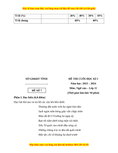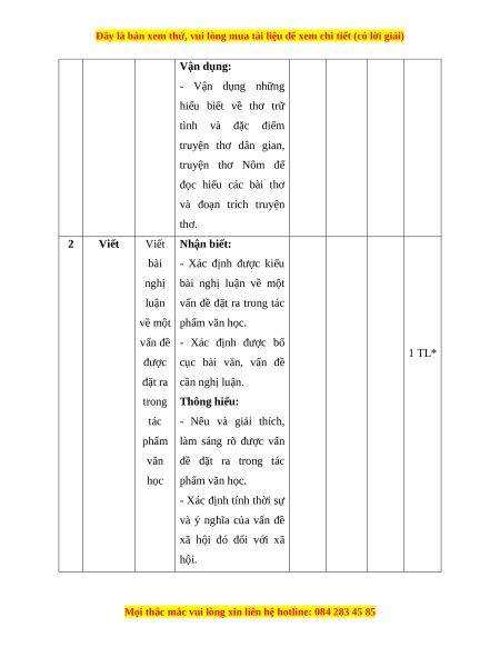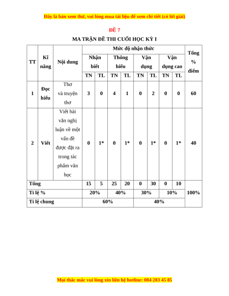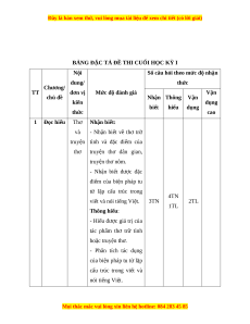 Mức độ nhận thức Tổng Kĩ Nhận Thông Vận Vận TT Nội dung % năng biết hiểu dụng dụng cao điểm TN TL TN TL TN TL TN TL Thơ Đọc 1 và truyện 3 0 4 1 0 2 0 0 60 hiểu thơ Viết bài văn nghị luận về một vấn đề 2 Viết 0 1* 0 1* 0 1* 0 1* 40 được đặt ra trong tác phẩm văn học Tổng 15 5 25 20 0 30 0 10 Tỉ lệ % 20% 40% 30% 10% 100% Tỉ lệ chung 60% 40%
