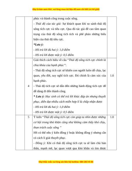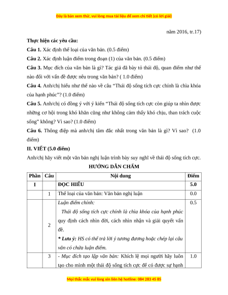 Anh/chị hãy viết một văn bản nghị luận trình bày suy nghĩ về thái độ sống tích cực. HƯỚNG DẪN CHẤM Phần Câu Nội dung Điểm I ĐỌC HIỂU 5.0 1