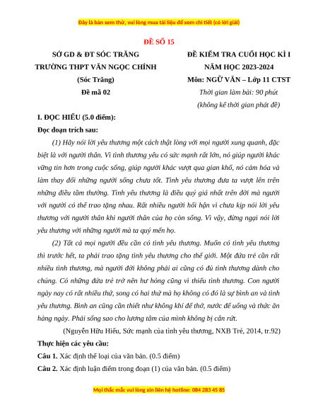 Môn: NGỮ VĂN – Lớp 11 CTST Đề mã 02