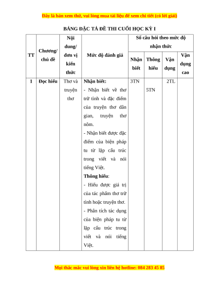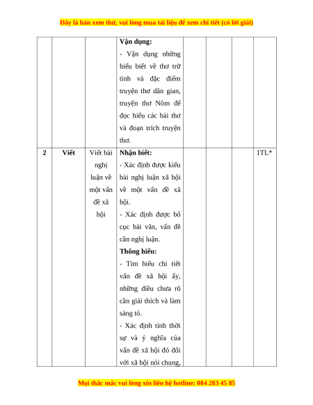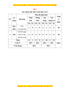Mức độ nhận thức Tổng Kĩ Nhận Thông Vận Vận TT Nội dung % năng biết hiểu dụng dụng cao điểm TN TL TN TL TN TL TN TL Đọc Thơ 1 3 0 5 0 0 2 0 0 60 hiểu và truyện thơ Viết bài nghị 2 Viết luận về một 0 1* 0 1* 0 1* 0 1* 40 vấn đề xã hội Tổng 15 5 25 15 0 30 0 10 Tỉ lệ % 20% 40% 30% 10% 100% Tỉ lệ chung 60% 40%