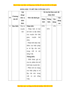 Số câu hỏi theo mức độ dung/ nhận thức Chương/ TT đơn vị Mức độ đánh giá Vận chủ đề Nhận Thông Vận kiến dụng biết hiểu dụng thức cao 1 Đọc hiểu Thơ và Nhận biết: 3TN 2TL