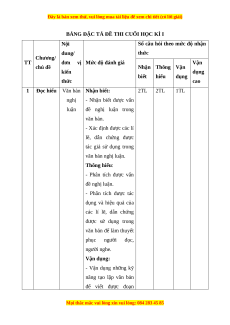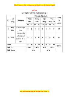 Mức độ nhận thức Tổng Kĩ Nhận Thông Vận Vận TT Nội dung % năng biết hiểu dụng dụng cao điểm TN TL TN TL TN TL TN TL Đọc Văn bản nghị 1 0 2 0 2 0 1 0 0 60 hiểu luận Viết bài văn nghị luận về 2 Viết 0 1* 0 1* 0 1* 0 1* 40 một vấn đề xã hội. Tổng 0 30 0 30 0 30 0 10 100% Tỉ lệ % 30% 30% 30% 10% Tỉ lệ chung 60% 40%