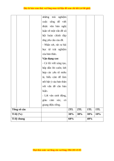 nổi bật ý của bản thân với vấn đề cần bàn luận. - Lời văn sinh động, giàu cảm xúc, có giọng điệu riêng. Tổng số câu 2TL 2TL 1TL 1TL Tỉ lệ (%) 30% 30% 30% 10% Tỉ lệ chung 60% 40%