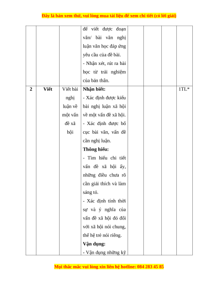 Đọc Văn bản nghị 1 2 1 1 1 0 2 0 0 50 hiểu luận Viết bài văn nghị luận về 2 Viết 0 1* 0 1* 0 1* 0 2* 50 một vấn đề xã hội. Tổng 20 10 20 10 0 20 0 20 100% Tỉ lệ % 30% 30% 20% 20% Tỉ lệ chung 60% 40%