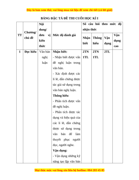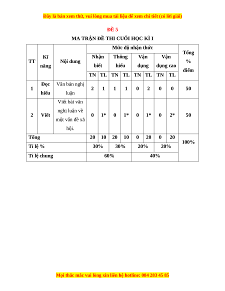 Đọc Văn bản nghị 1 2 1 1 1 0 2 0 0 50 hiểu luận Viết bài văn nghị luận về 2 Viết 0 1* 0 1* 0 1* 0 2* 50 một vấn đề xã hội. Tổng 20 10 20 10 0 20 0 20 100% Tỉ lệ % 30% 30% 20% 20% Tỉ lệ chung 60% 40%
