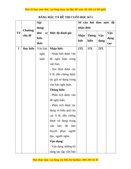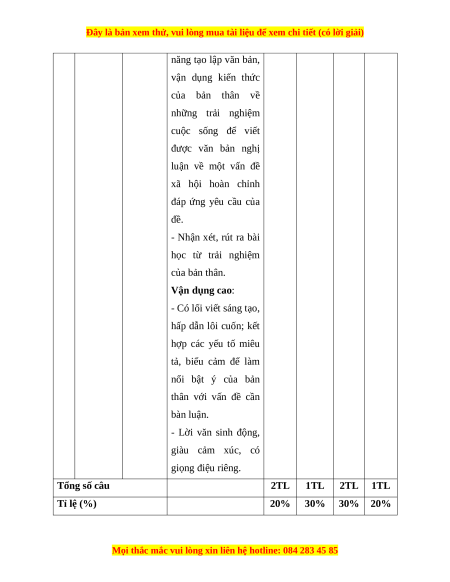 hấp dẫn lôi cuốn; kết hợp các yếu tố miêu tả, biểu cảm để làm nổi bật ý của bản thân với vấn đề cần bàn luận. - Lời văn sinh động, giàu cảm xúc, có giọng điệu riêng. Tổng số câu 2TL 1TL 2TL 1TL Tỉ lệ (%) 20% 30% 30% 20%