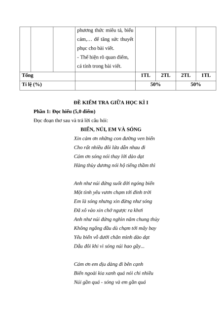 Mức độ nhận thức T Năng Mạch nội Tổng Vận dụng T lực dung Nhận biết Thông hiểu Vận dụng % cao Năng 1 lực Thơ 1 2 2 0 50 Đọc Viết bài văn