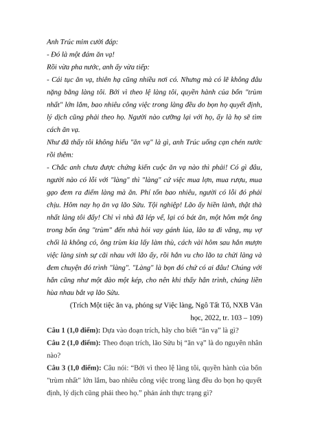 (Trích Một tiệc ăn vạ, phóng sự Việc làng, Ngô Tất Tố, NXB Văn học, 2022, tr. 103 – 109)