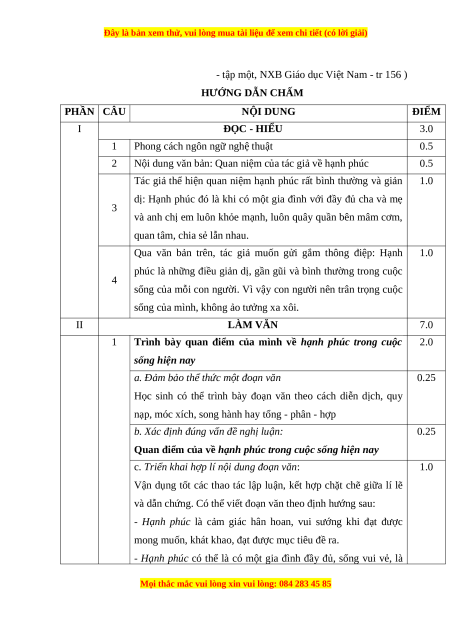 - tập một, NXB Giáo dục Việt Nam - tr 156 ) HƯỚNG DẪN CHẤM PHẦN CÂU NỘI DUNG ĐIỂM I ĐỌC - HIỂU 3.0 1