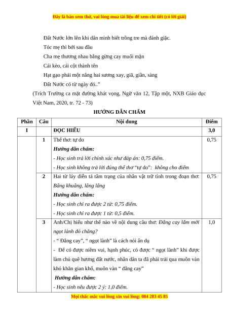 (Trích Trường ca mặt đường khát vọng, Ngữ văn 12, Tập một, NXB Giáo dục Việt Nam, 2020, tr. 72 - 73) HƯỚNG DẪN CHẤM Phần Câu Nội dung Điểm I ĐỌC HIỂU 3,0 1 Thể thơ: tự do 0,75