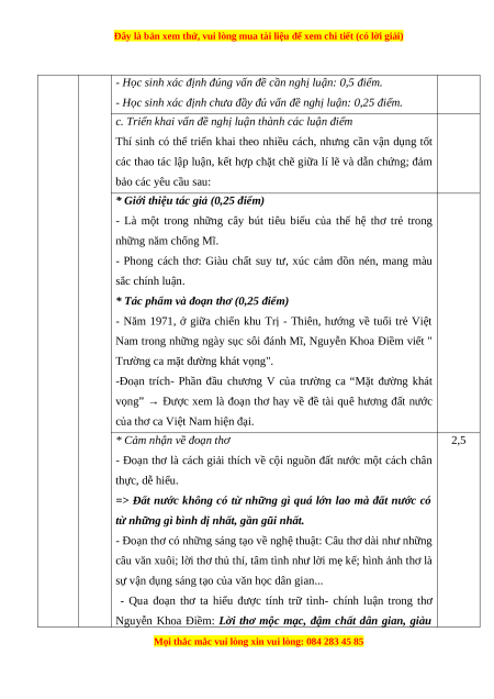 - Học sinh xác định chưa đầy đủ vấn đề nghị luận: 0,25 điểm.