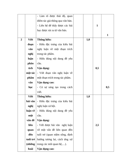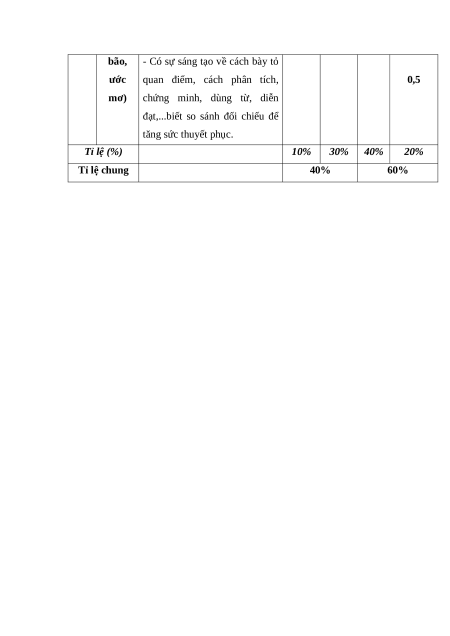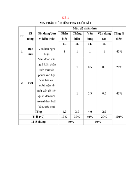 TT năng vị kiến thức biết hiểu dụng cao điểm TL TL TL TL Đọc Văn bản nghị 1 1 1 1 1 40% hiểu luận Viết đoạn văn nghị luận phân 1 0,5 0,5 20% tích một tác phẩm văn học Viết bài văn 2 Viết nghị luận về một vấn đề liên 1 2,5 0,5 40% quan đến tuổi trẻ (những hoài bão, ước mơ) Tổng 1,0 3,0 4,0 2,0 Tỉ lệ (%) 10% 30% 40% 20% 100% Tỉ lệ chung 40% 60%