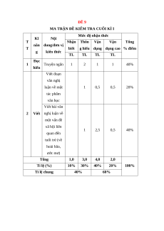g hiểu dụng dụng cao % điểm g kiến thức TL TL TL TL Đọc 1 Truyện ngắn 1 2 1 1 40% hiểu Viết đoạn văn nghị luận về một 1 0,5 0,5 20% tác phẩm văn học Viết bài văn 2