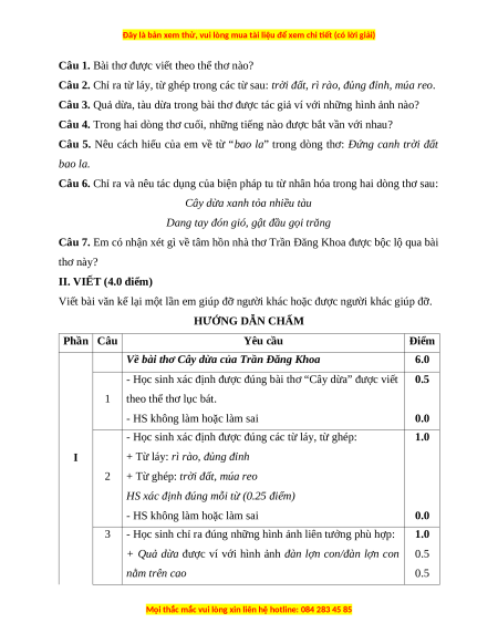 - Học sinh xác định được đúng bài thơ “Cây dừa” được viết 0.5 1 theo thể thơ lục bát.