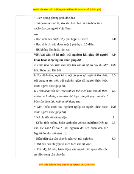 - Học sinh nêu được 02 ý phù hợp: 1.0 điểm 0.0
