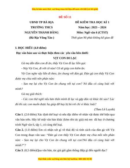 Đề thi cuối kì 1 Ngữ văn 6 Chân trời sáng tạo (đề 11)