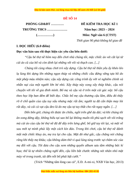Đề thi cuối kì 1 Ngữ văn 6 Chân trời sáng tạo (đề 14)