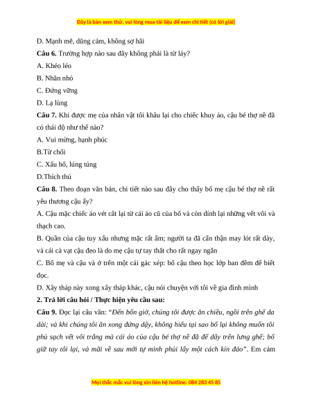 Câu 8. Theo đoạn văn bản, chi tiết nào sau đây cho thấy bố mẹ cậu bé thợ nề rất yêu thương cậu ấy?