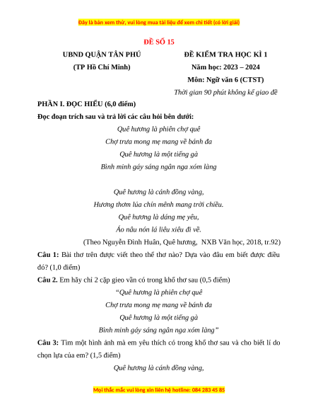 - Tailieugiaovien.com.vn giới thiệu bộ 15 đề cuối kì 1 môn Ngữ văn 6 Chân trời sáng tạo mới nhất nhằm giúp Giáo viên có thêm tài liệu tham khảo ra đề thi Ngữ văn lớp 6.