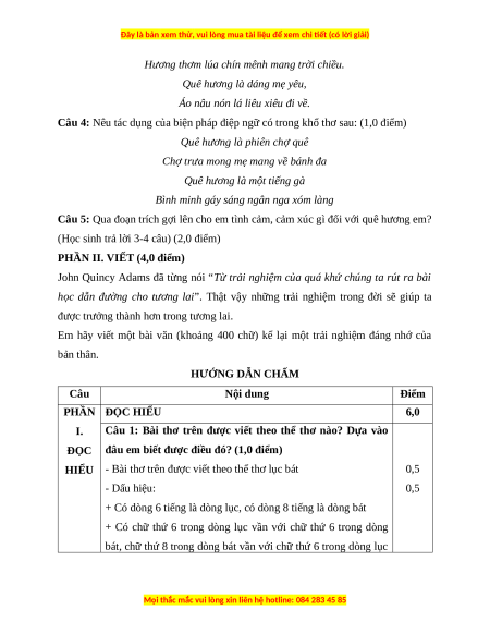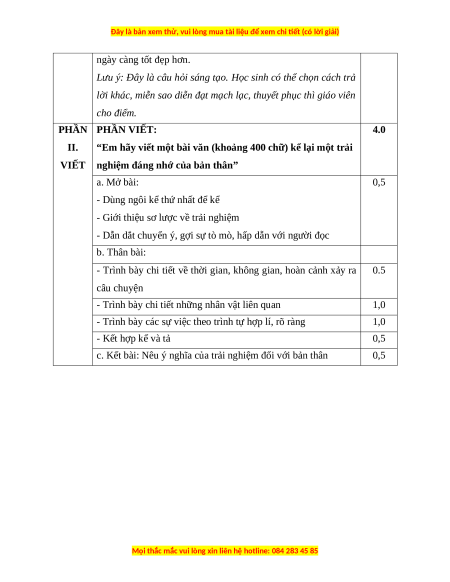 Em hãy viết một bài văn (khoảng 400 chữ) kể lại một trải nghiệm đáng nhớ của bản thân. HƯỚNG DẪN CHẤM Câu Nội dung Điểm PHẦN ĐỌC HIỂU 6,0 I.
