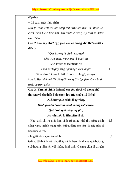 Lưu ý: Học sinh trả lời đúng 02 trong 03 cặp gieo vần trên thì
