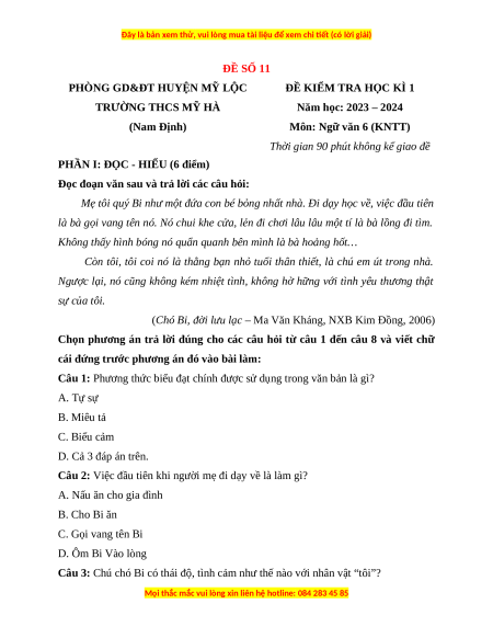 Đề thi cuối kì 1 Ngữ văn 6 Kết nối tri thức - Đề 11