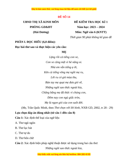 Đề thi cuối kì 1 Ngữ văn 6 Kết nối tri thức - Đề 14
