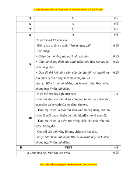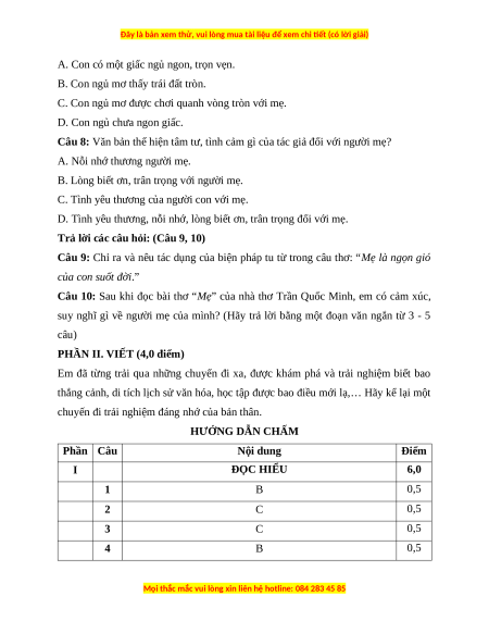 chuyến đi trải nghiệm đáng nhớ của bản thân. HƯỚNG DẪN CHẤM Phần Câu Nội dung Điểm I ĐỌC HIỂU 6,0 1 B 0,5 2 C 0,5 3 C 0,5 4 B 0,5