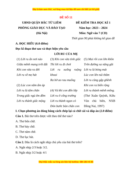 Năm học: 2023 – 2024 (Hà Nội) Môn: Ngữ văn 7 (CD)