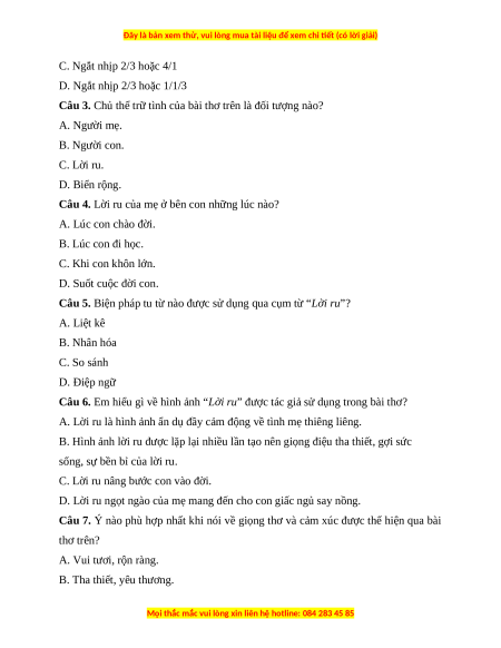 Câu 5. Biện pháp tu từ nào được sử dụng qua cụm từ “Lời ru”? A. Liệt kê B. Nhân hóa C. So sánh D. Điệp ngữ