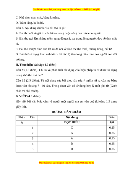 Hãy viết bài văn biểu cảm về người một người mà em yêu quý (khoảng 1,5 trang giấy thi). HƯỚNG DẪN CHẤM Phần Câu Nội dung Điểm A ĐỌC HIỂU 6,0 1 C 0,25 2 A 0,25 3 A 0,25 4 D 0,25 5 D 0,25