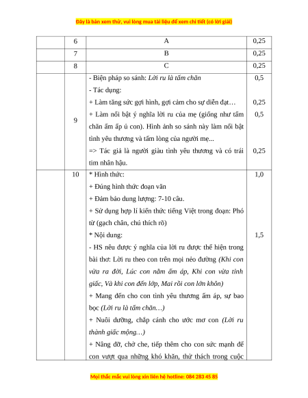 Câu 10 (2.5 điểm). Từ nội dung của bài thơ, hãy nêu ý nghĩa lời ru của mẹ bằng