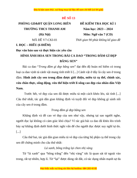 Năm học: 2023 – 2024 (Hà Nội) Môn: Ngữ văn 7 (CD) MÃ ĐỀ V7-CKI-01