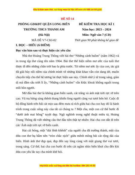 Năm học: 2023 – 2024 (Hà Nội) Môn: Ngữ văn 7 (CD) MÃ ĐỀ V7-CKI-02