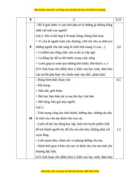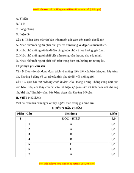 Viết bài văn nêu cảm nghĩ về một người thân trong gia đình em. HƯỚNG DẪN CHẤM Phần Câu Nội dung Điểm I ĐỌC – HIỂU 6,0 1 A 0,25 2 A 0,25 3 D 0,25 4 B 0,25 5 C 0,25 6 C 0,25 7 A 0,25