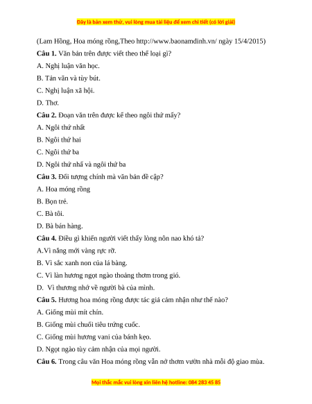 Câu 3. Đối tượng chính mà văn bản đề cập? A. Hoa móng rồng B. Bọn trẻ. C. Bà tôi. D. Bà bán hàng.