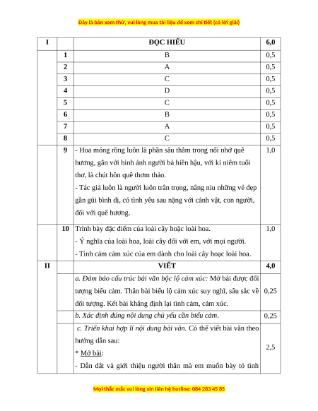 I ĐỌC HIỂU 6,0 1 B 0,5 2 A 0,5 3 C 0,5 4 D 0,5 5 C 0,5 6 B 0,5 7 A 0,5 8 C 0,5
