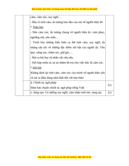 về người thân yêu nhất. HƯỚNG DẪN CHẤM Phần Câu Nội dung Điểm