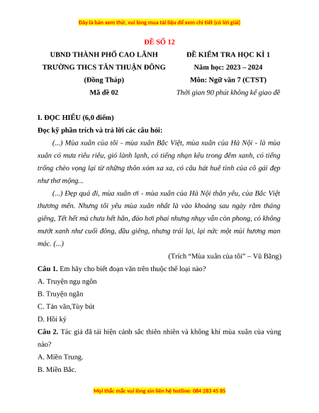 Môn: Ngữ văn 7 (CTST) Mã đề 02