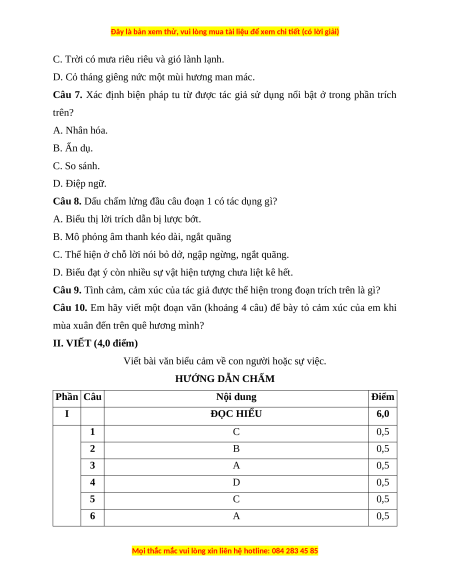 Viết bài văn biểu cảm về con người hoặc sự việc. HƯỚNG DẪN CHẤM Phần Câu Nội dung Điểm I ĐỌC HIỂU 6,0 1 C 0,5 2 B 0,5 3 A 0,5 4 D 0,5 5 C 0,5 6 A 0,5