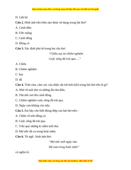 Câu 2. Hình ảnh tiêu biểu nào được sử dụng trong bài thơ? A. Cánh diều B. Ước mộng C. Cánh đồng D. Đồng cỏ